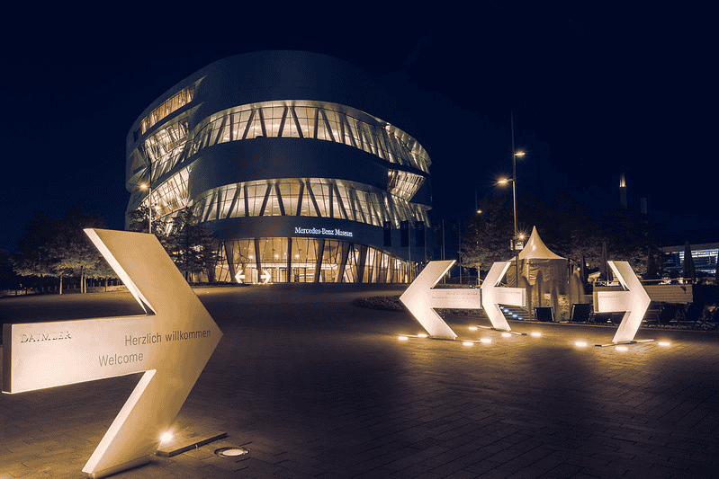 The Mercedes-Benz Museum in Stuttgart shows the history of the luxury cars and the Mercedes-Benz brand in terms of design, technology and social contribution. It has over 1,600 exhibits, including 160 vehicles, across 9 levels. The museum tells the story of cars from the first invention by Carl Benz in 1886, to modern times.